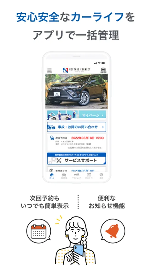 ご購入いただいたおクルマの情報はもちろん、次回予約や点検情報などアプリひとつで管理できます。