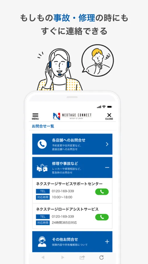 ・事故、修理の際はHOME画面よりお問い合わせ先へ簡単にアクセス。