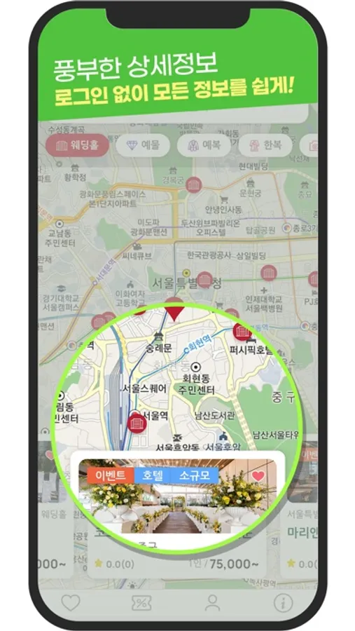 언제 어디서나 가입과 로그인 없이 결혼 준비 장소를 확인할 수 있어요.