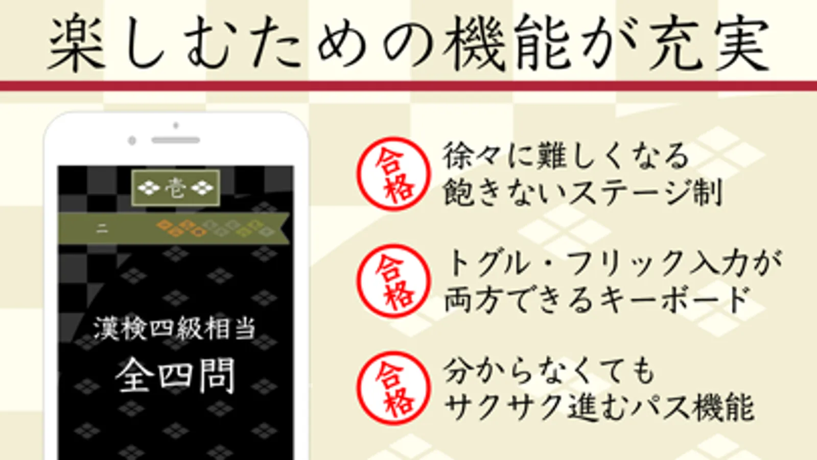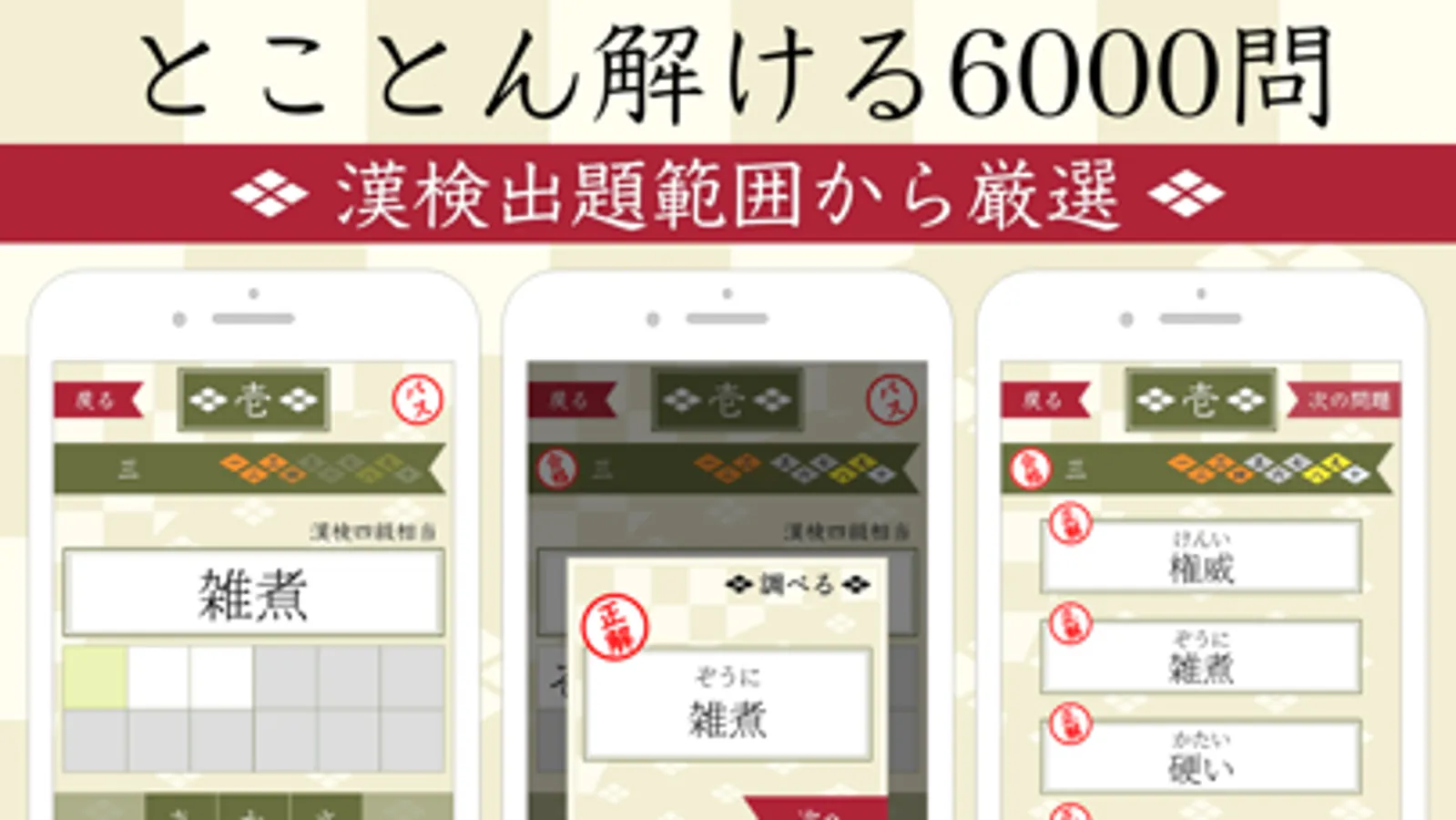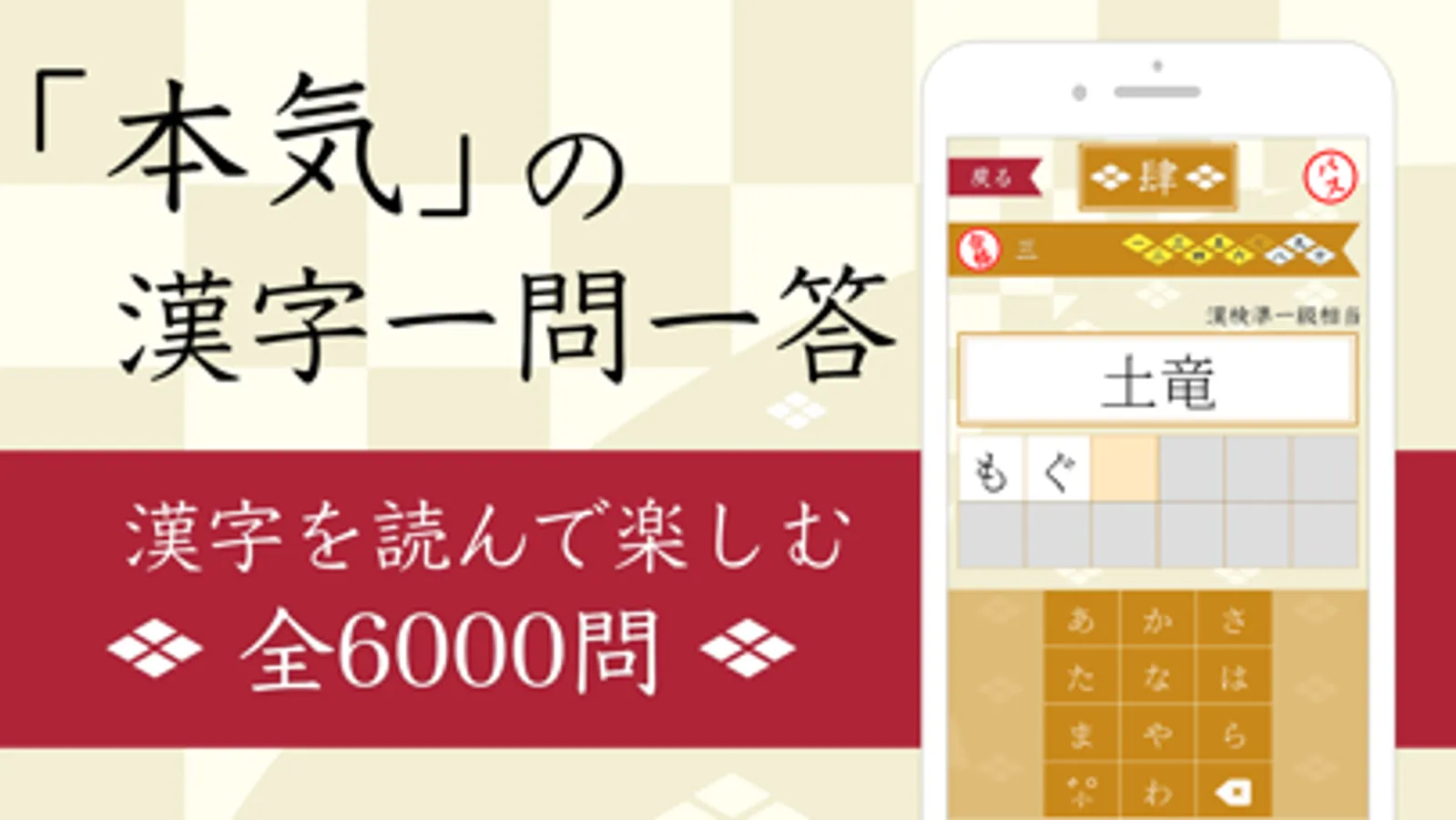 漢検出題範囲から厳選された6000問(600ステージ×10問)のクイズ。大満足の問題数で、飽きずに長く楽しめます。