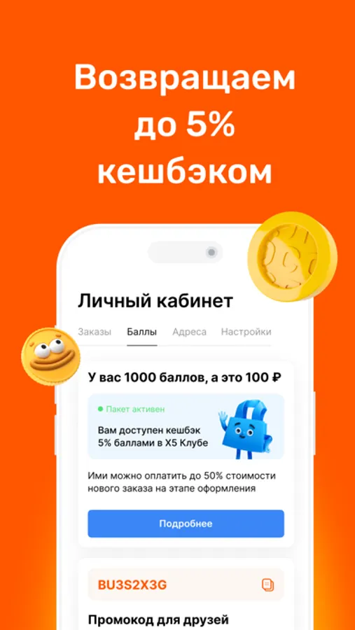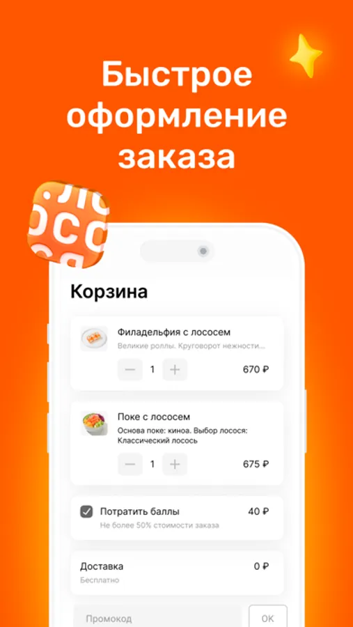 В приложении доступна программа лояльности «X5 Клуб». Получайте и расплачивайтесь едиными баллами в «Много лосося» и магазинах «Пятёрочка», «Перекрёсток».