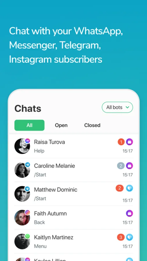 SendPulse ChatBots is a mobile version of chats with subscribers from WhatsApp, Telegram, Facebook Messenger and Instagram chatbots that gives you the ability to control your bots.