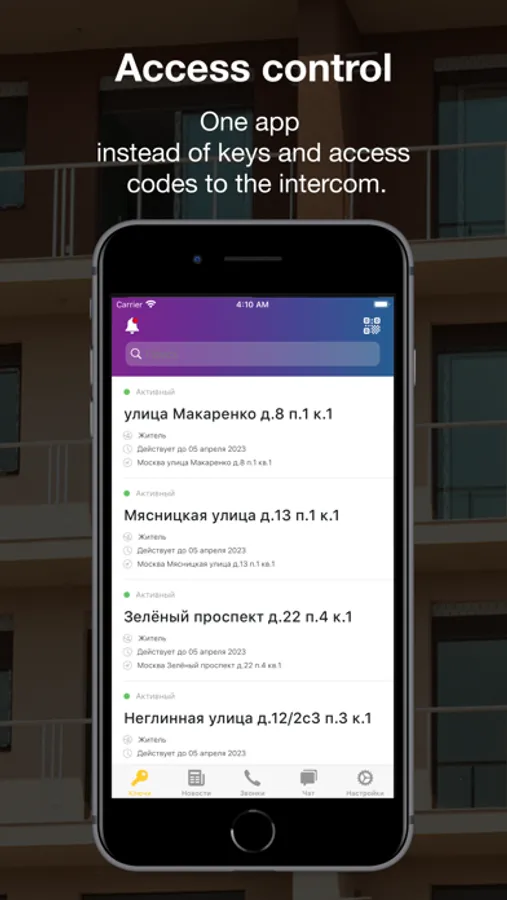 How does it work? When you receive a key to the residence address you automatically get access to the common chat room of the entrance or you will be able to start a chat with the residents of the apartment you need. Chats are private, and only the residents of the building are allowed there. You will be able to communicate in chats, as well as make audio or video calls with your neighbors;