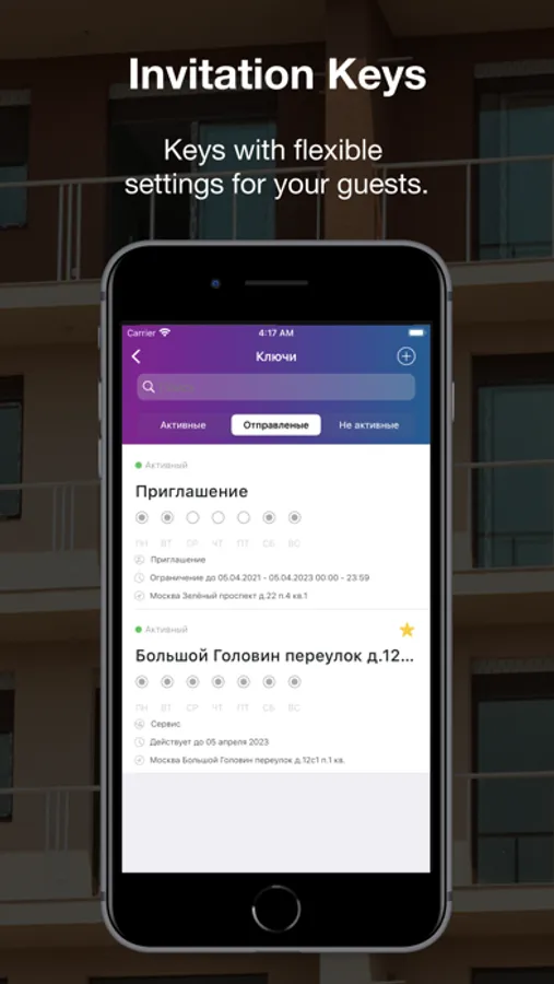 How does it work? Your guest must be registered in our app. Find them by their phone number or nickname. Set visit dates and times, or give them a permanent key for the required duration. The guest will be able to walk up to the entrance, scan the QR code or NFC tag and, if access is granted, the door will open. You will be able to revoke the issued key at any time;