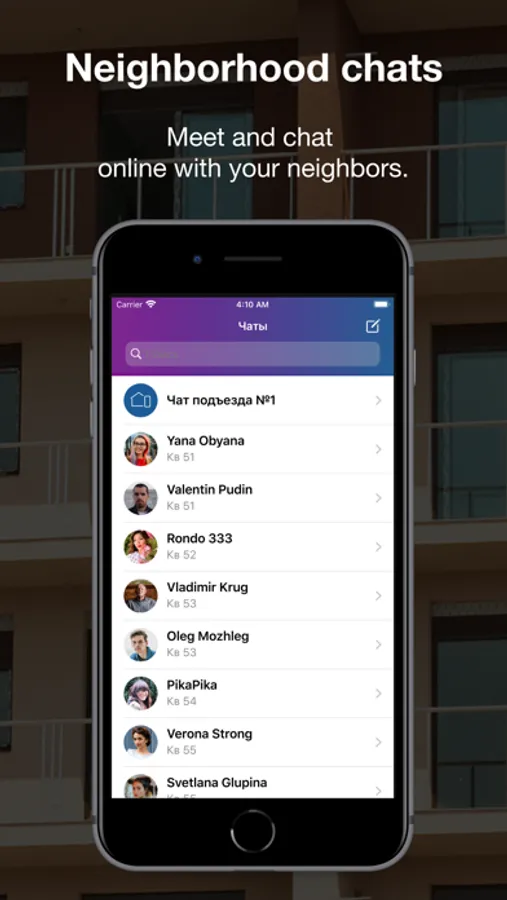 Meet and chat with your neighbors in private and group online chats, solve important issues and get important information from management companies and city services.