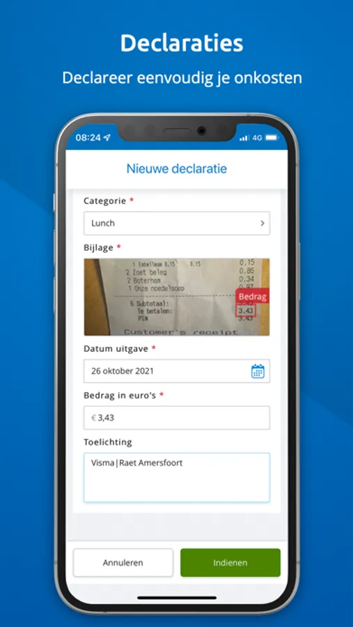 - Claiming expenses: Take a picture of your receipt and the app instantly fills in the amount and date. Click ‘Submit’ and your claim will be sent to your manager for approval.