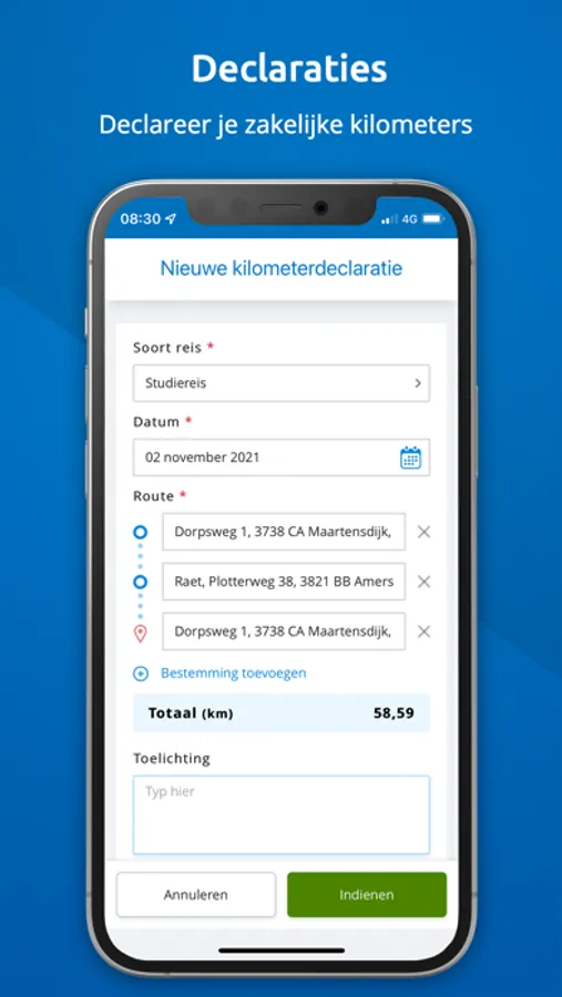 - Claiming business kilometres: Record your departure and arrival location, and the app automatically calculates the distance and puts it in the claim.
