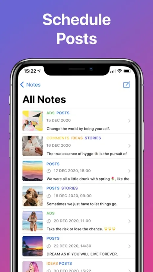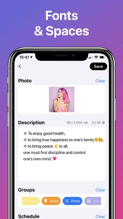 Write your captions in advance and perfect them. Save your hashtag groups within the app and add them to new posts at a press of a button.