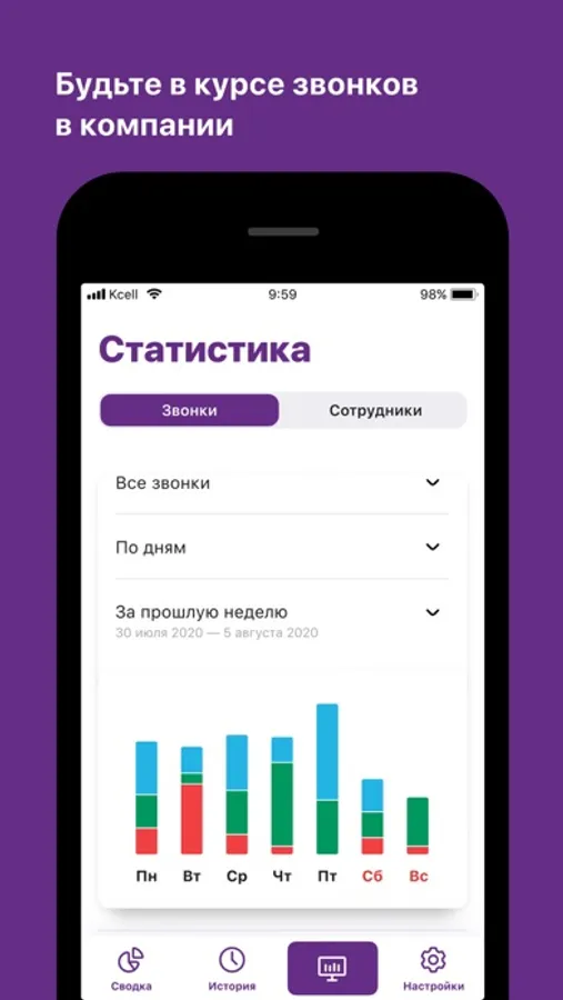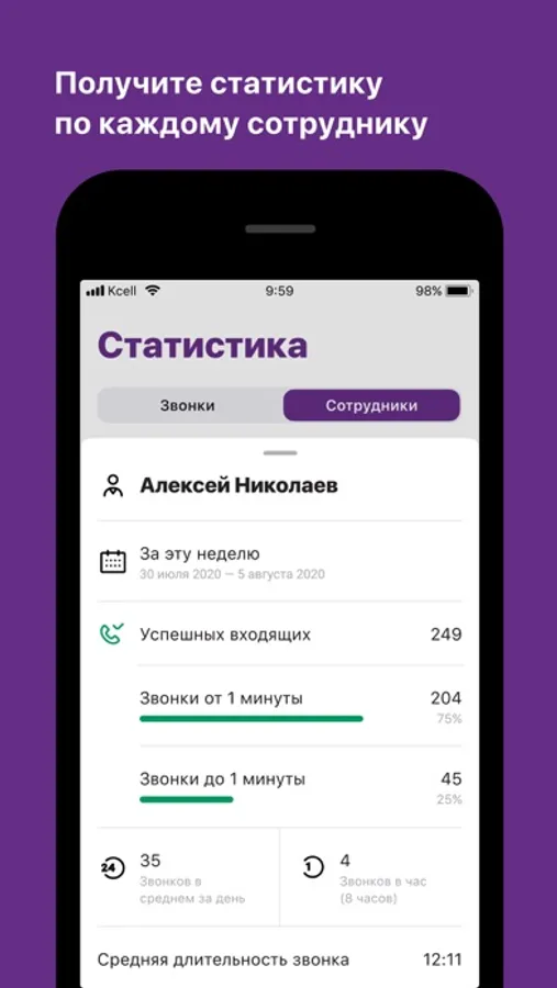 - следите за статистикой по звонкам за произвольный период и по любому сотруднику;