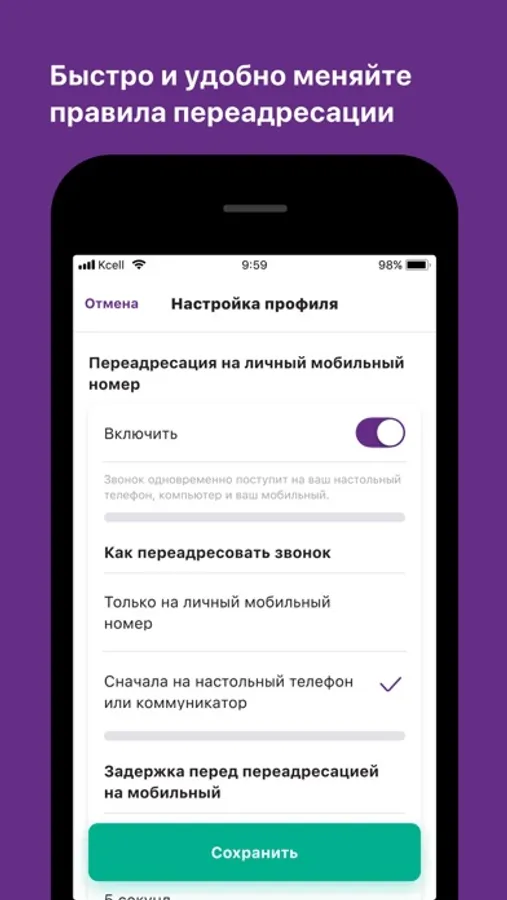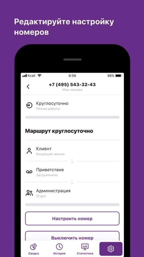 Встречайте удобную альтернативу веб-интерфейса Виртуальной АТС от Kcell. Заходите в личный кабинет ВАТС через мобильное приложение и пользуйтесь основными функциями Виртуальной АТС в любое время и в любом месте.