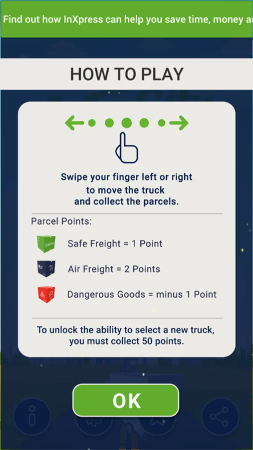 You are an InXpress Customer and you need to arrange delivery of a package. Login to our shipping platform, Webship+, choose your carrier and gain points for parcels collected along the way! Make sure not to hit a pedestrian or another vehicle, and be careful to avoid dangerous red packages! The aim of the game is to collect as many green and blue parcels as possible to gain points and avoid red parcels that reduce points. When you start the game you will be forced to use one carrier but once you’ve obtained 50 points, this will unlock the ability to choose your carrier. All movements are made by swiping the screen (move left and right). Only gross motor and fast reaction time skills are required to play.