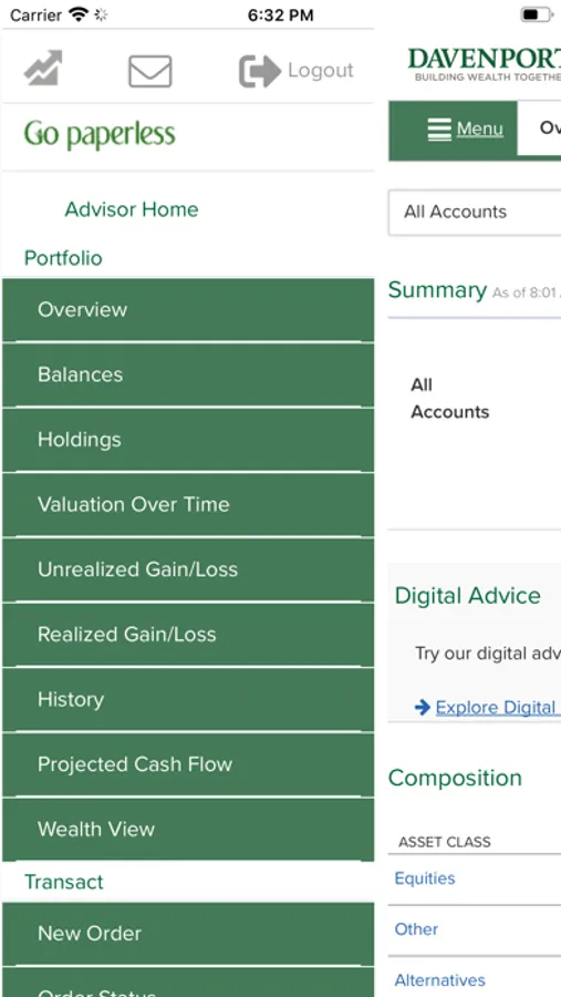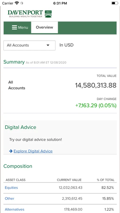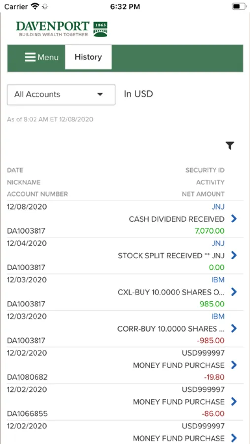 The Davenport & Company Mobile Application is a free app that allows you to monitor your Davenport accounts on a mobile phone or tablet. Davenport Mobile provides anytime, anywhere access your accounts using your Davenport Online login ID and password.