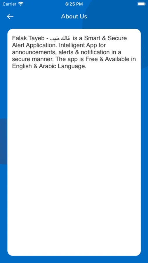 Falak Tayeb - فالك طيب is a Smart & Secure Alert Application. Intelligent App for announcements, alerts & notification in a secure manner. The app is Free & Available in English & Arabic Language.