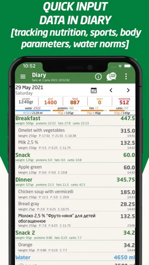 The largest base of food calories, a convenient ergonomic interface, fast data entry and a personalization option will help you control your weight, whether you choose to loose or gain it.