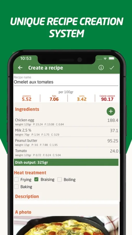 • A unique way to add recipes: it takes heat treatment into account when calculating calorie intake.