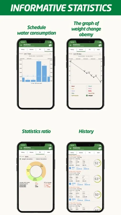 • Comprehensive statistics (control of proteins, fats, carbohydrates and calories, control of consumed water, weight and volume graphs, PFC ratio diagrams).