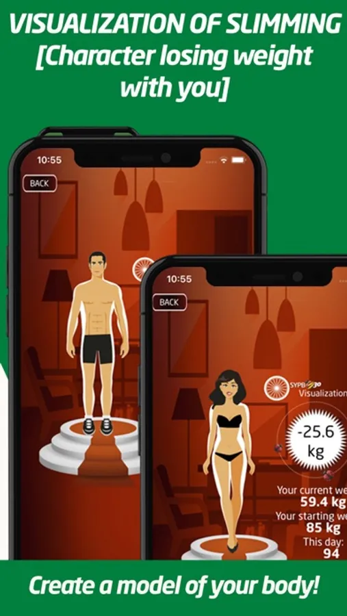 • The character in the app who is losing or gaining weight with you to visualize your body changes is your perfect motivator.