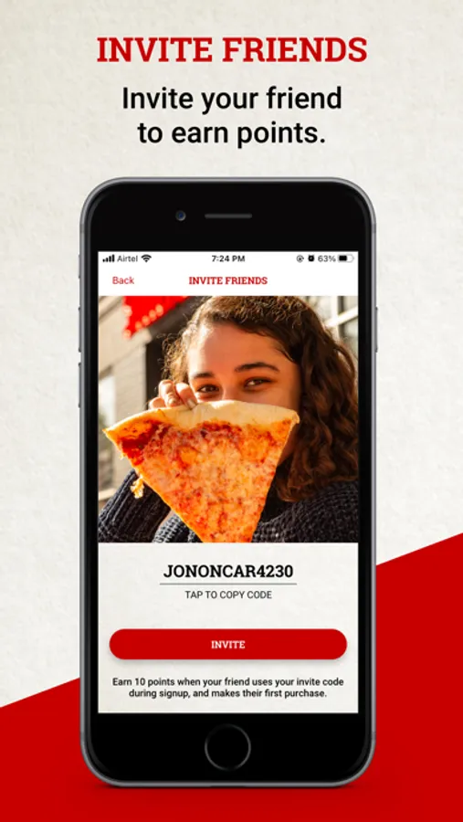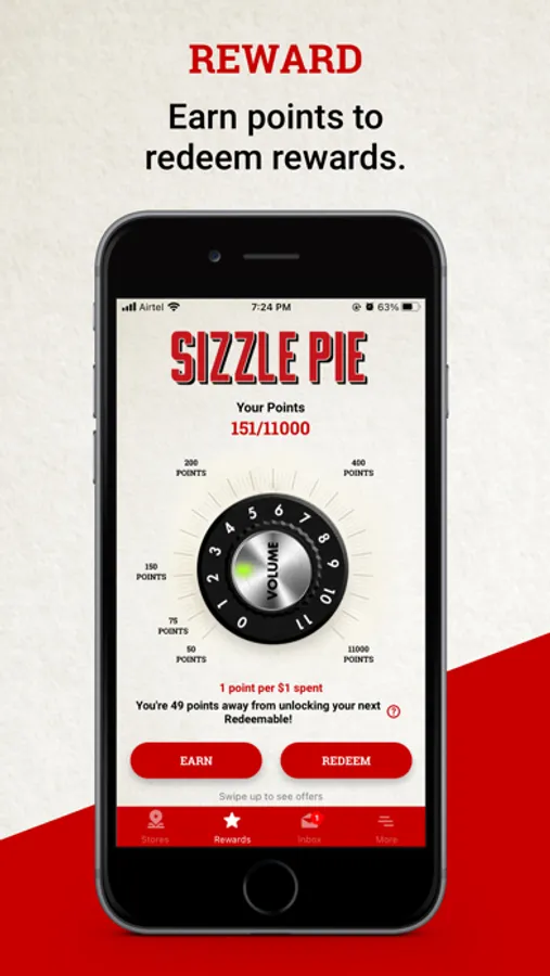 • Earn a pizza point for every dollar spent.