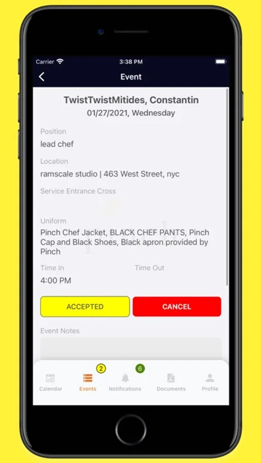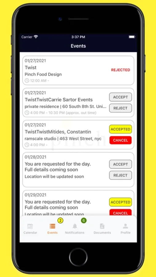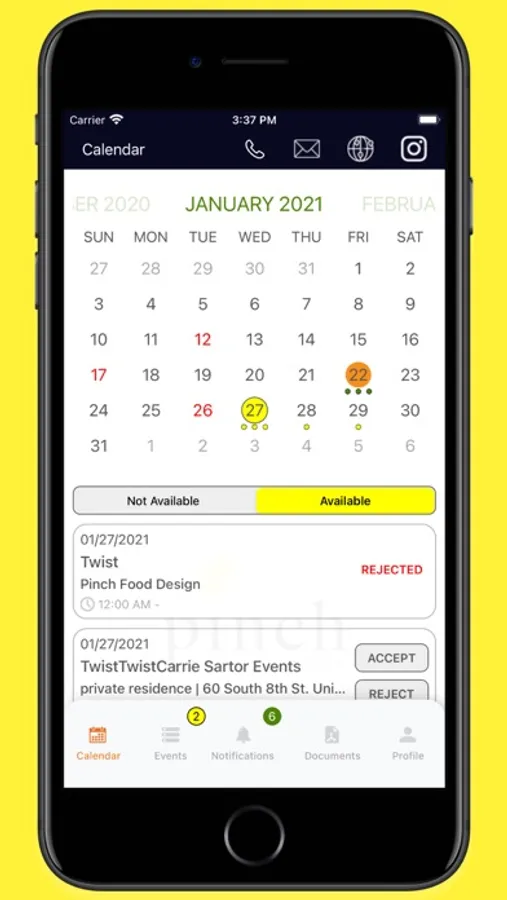 Welcome to the Pinch Foods Design app for managing your catering schedule. This app will help you set your event schedule and availability as well as let you know when you have been booked for an event. More features are coming! Enjoy!