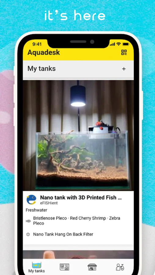 Print out a QR code right from the app. Place it on or near the tank and scan it to access your tank on aquadesk.