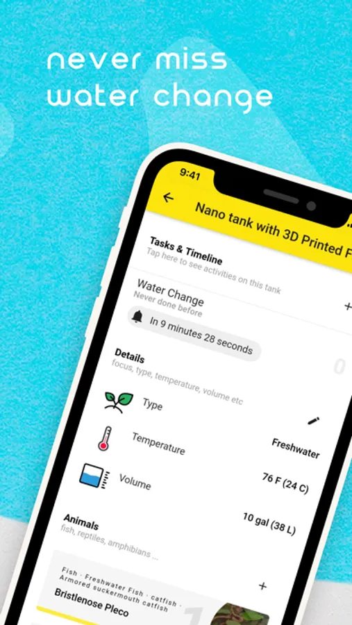 Get notified with a push notification when you set up recurring tasks. Get notified for regular water change or an important treatment for your fish and/or tank.