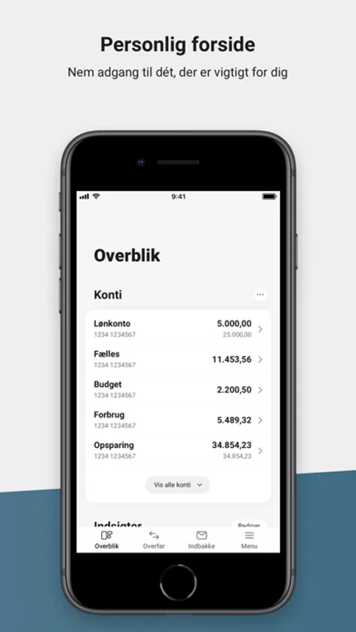 Mobilbank fra Nordfyns Bank med personlig forside og nem adgang til dét, der er vigtigt for dig.