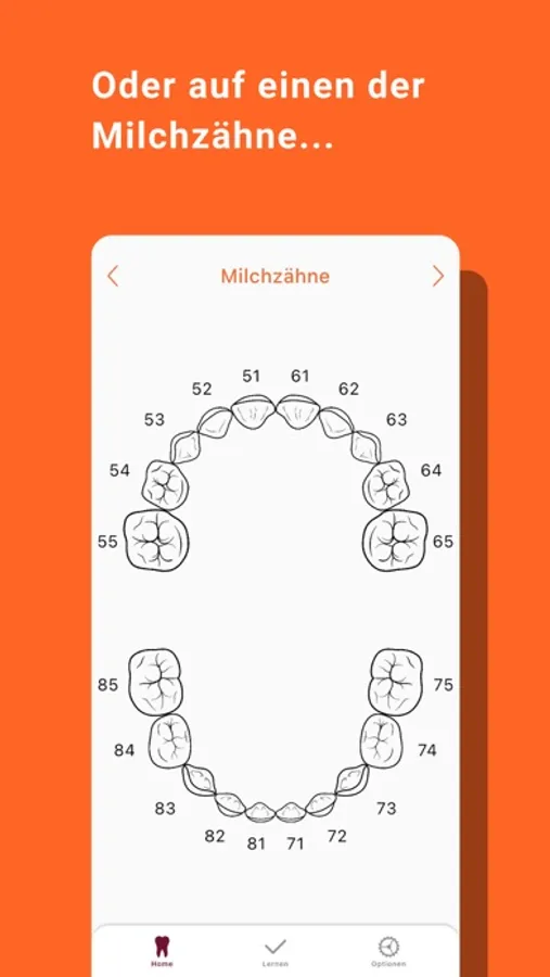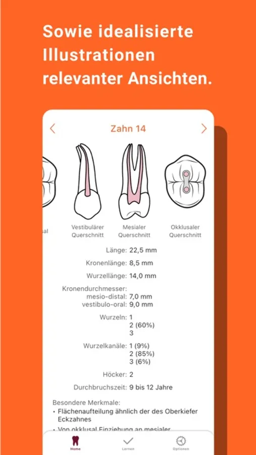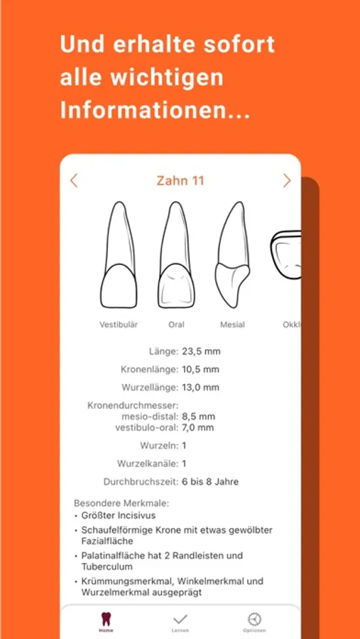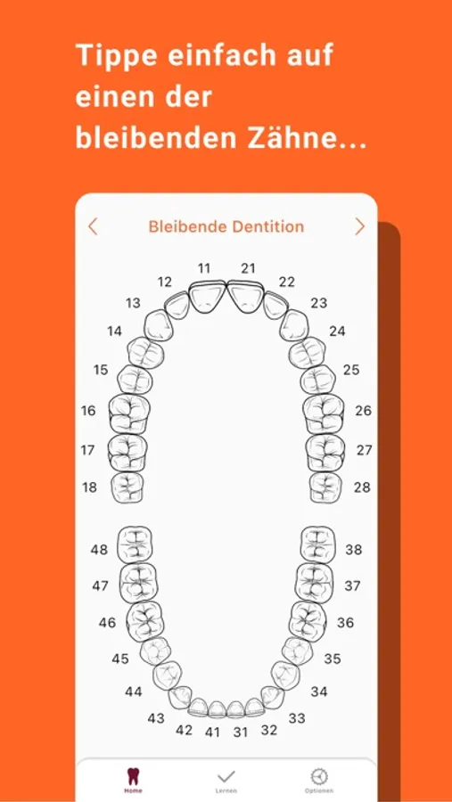 Diese App dient dem Studium der menschlichen Zahnanatomie und stützt sich dabei auf entsprechende Literatur (siehe Quellen unter den Optionen). Sie soll keine medizinischen Diagnosen, Empfehlungen oder Berechnungen vermitteln. Bei medizinischen Fragen zu Therapie, Empfehlungen und Diagnosen wendens Sie sich bitte an Ihren Zahnarzt / Ihre Zahnärztin. Bei technischen und inhaltlichen Fragen/Anmerkungen nutzen Sie bitte unsere Kontaktlinks in den Optionen.