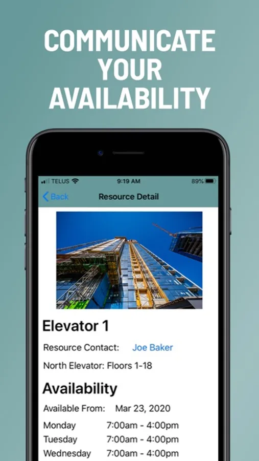 - Configurable options to define your project resources including cranes and hoists, staging and unloading areas, elevators and meeting rooms.