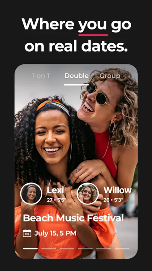 *YES learns what type of activities and events you enjoy and shows you a personalized stream of profiles with dating experiences to choose from. On YES, you can explore ONE-ON-ONE dates, DOUBLE dates, and GROUP dates.