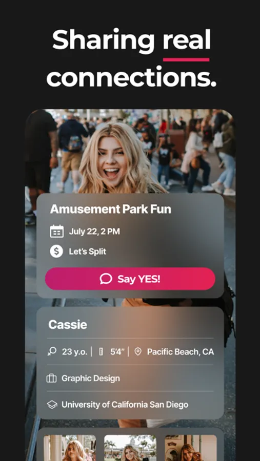 Imagine a dating app without awkward opening lines, endless messaging, and matches stuck in limbo. YES cuts out all the noise, providing you a way to connect with real people through shared experiences, based on common interests. Maybe you feel like meeting for a walk on the beach, or drinks at the new speakeasy in town, or catching one of your favorite local bands. That’s how it all begins on YES.