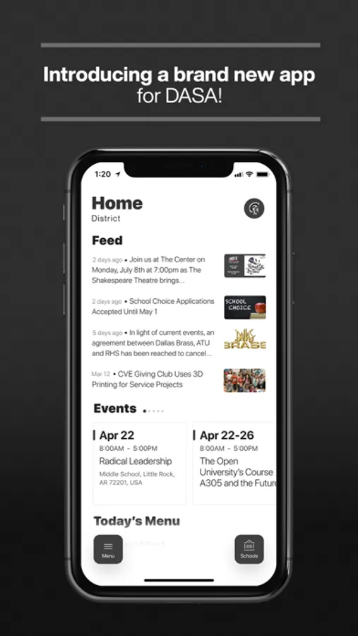 The event section shows a list of events throughout the district. Users can add an event to your calendar to share the event with friends and family with one tap.