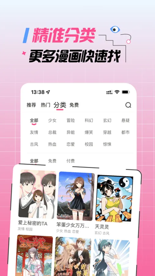 个性分类,智慧搜索分类涵盖日韩,搞笑,热血,悬疑,友情,少女,科幻,治愈,校园,恋爱,彩虹等各类漫画,个性化推荐满足漫画迷们的挑剔口味;超方便的智能搜索引擎,海量关键词汇搜索引导,精彩漫画触手可得,操作人性化,软件风格简约时尚,重点突出,上手容易,让你嗨翻天。