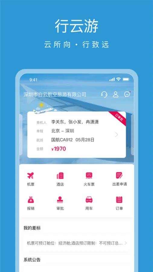行云游是南航全资子公司,深圳市白云航空旅游有限公司为方便企业客户因公因私出行及旅游会展业务而研发的一款APP,可满足企业用户一站式差旅产品预订,系统内具有申请、审批、消息通知等企业OA功能,并可预订机票、酒店、火车票、用车、保险等产品,帮助企业用户管控差旅成本,优化差旅流程,提升差旅管理效率