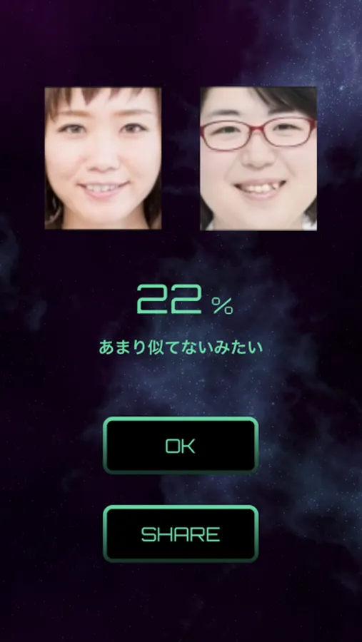 本アプリは撮影した2枚の顔画像から類似度を撮影端末内で解析します。