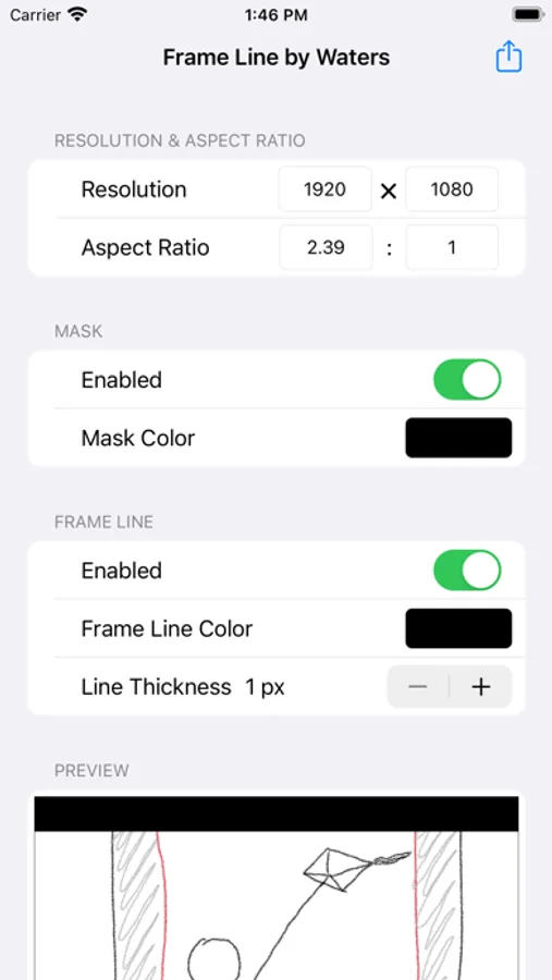 FrameLine可以生成特定分辨率、特定比例的遮罩、画框线,并可以对其透明度、颜色进行自由调整。
