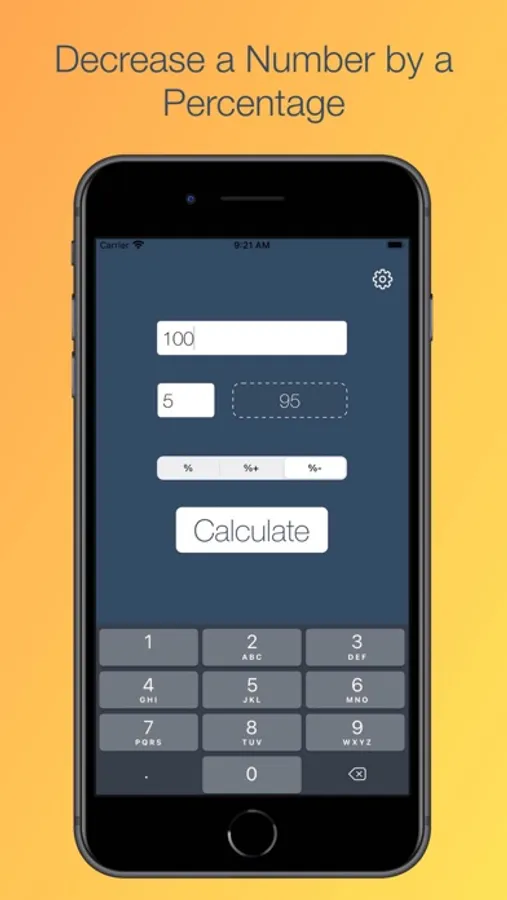 • Quick and easy switching between three different calculation types (1. Percentage of a number, 2. Increase a number by a percentage, 3. Decrease a number by a percentage)