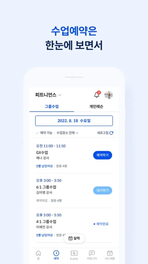 언제 어디서나 스마트폰에서 원하는 시간에 수업을 간편하게 예약하는 피트니언스.