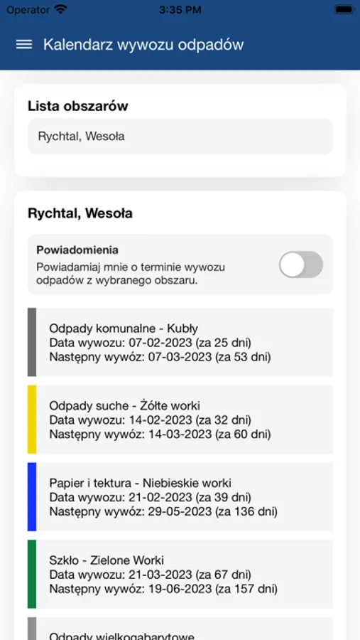 Aplikacja przypomni o terminie odbioru poszczególnych odpadów, poinformuje o zasadach prowadzenia selektywnej zbiórki odpadów, powiadomi o aktualnościach związanych z tą tematyką. Moduł umożliwia dodatkowo wysyłanie reklamacji odnośnie braku odbioru odpadów, uszkodzonego pojemnika lub innych sytuacji.