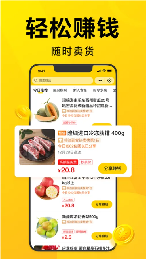 【爆品高佣】平台提供海量优质商品,新人特惠商品、爆款商品等,您可以一键分享,顾客下单后次日完成自提后即可获取高额佣金;