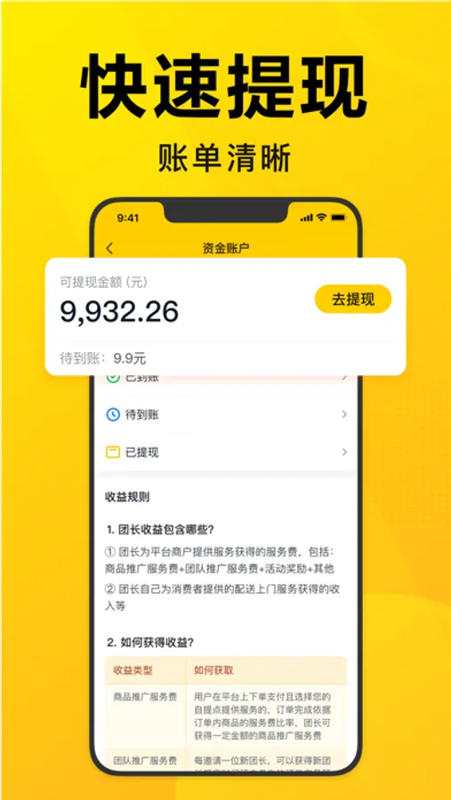 【随时提现】平台提供商品售卖收入明细,一目了然,您可以随时提现到账,无手续费。