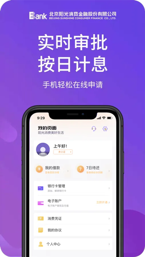 北京阳光消费金融股份有限公司(简称“阳光消费”)成立于2020年8月,是经中国银保监会批准设立的全国性消费金融公司之一,由中国光大银行、中青旅、王道银行共同发起设立。阳光消费金融致力于服务大众,践行普惠金融,为客户提供优质、便捷、安全的消费金融服务。