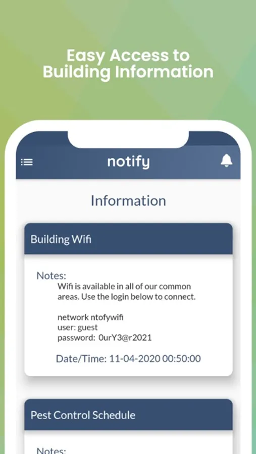 Notify is a building management mobile app for tenants to receive notifications, access info about shared building resources and amenities, request help or maintenance, track mail packages, food deliveries and more. This is the tenant edition, if you are a building admin please download the admin edition.