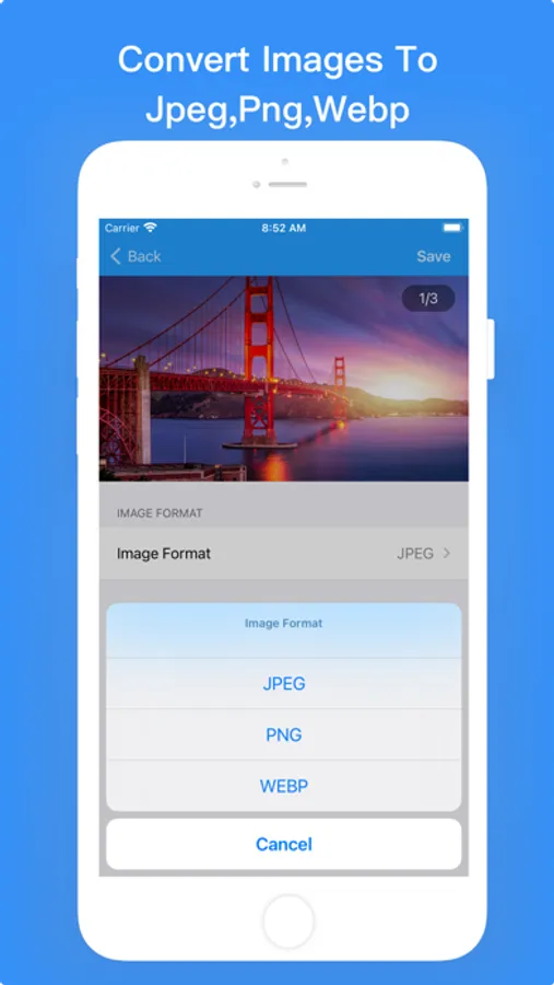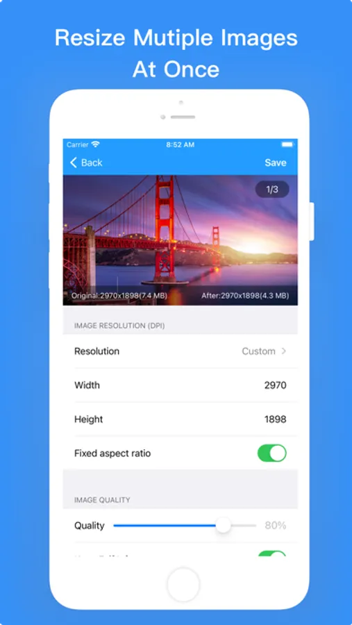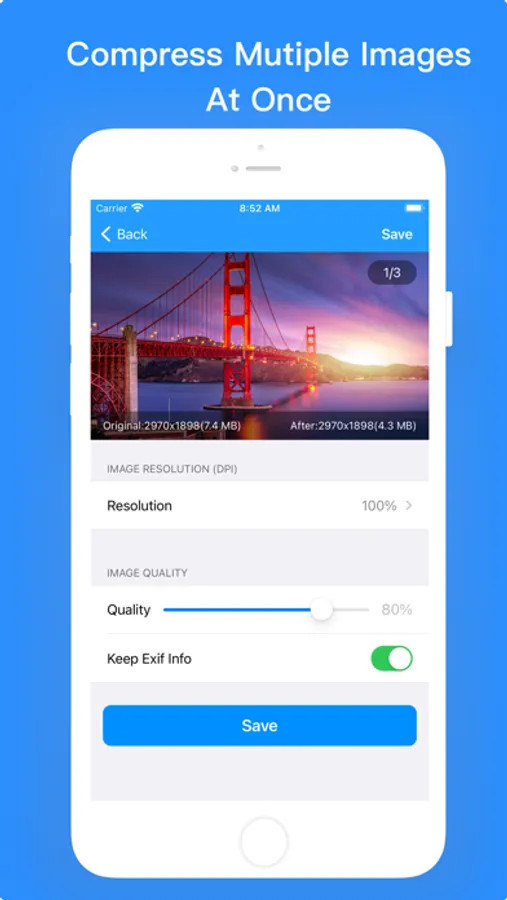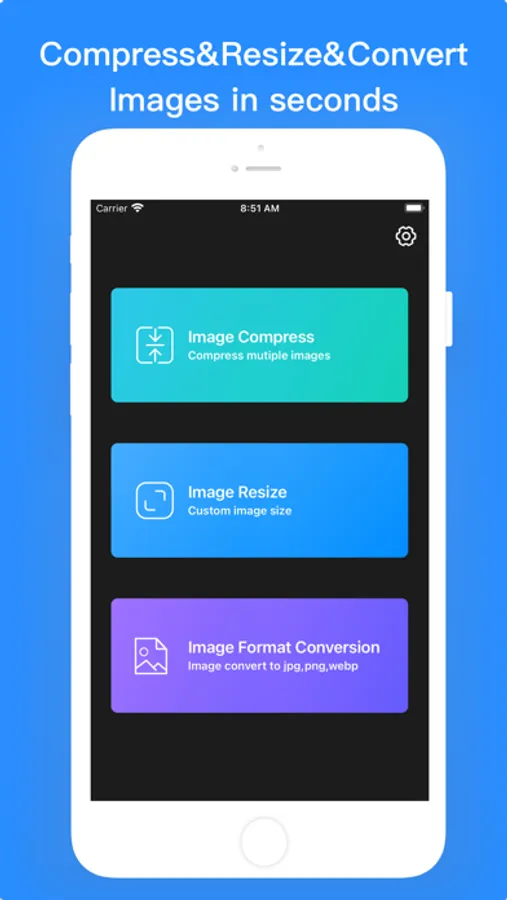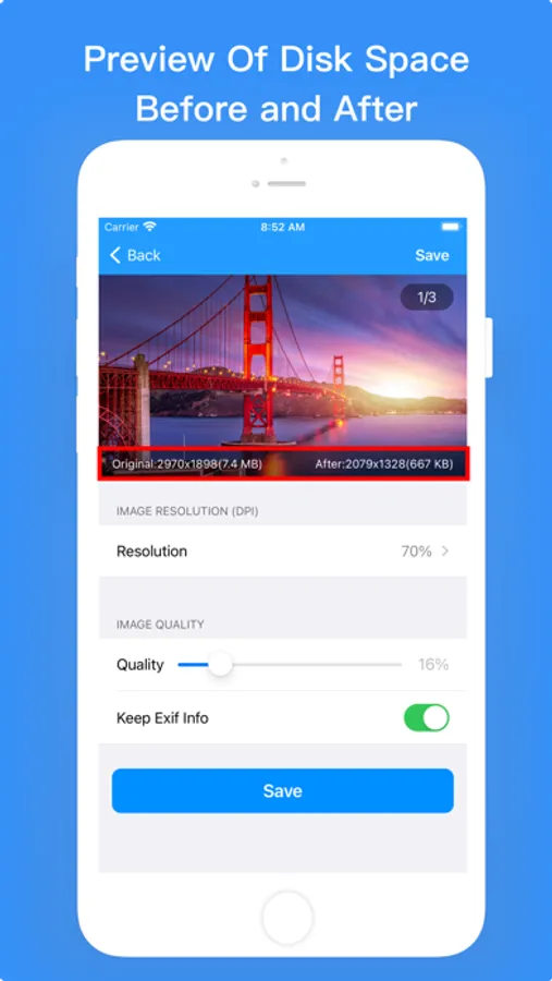 This is a powerful tool to compress photos, resize photos for saving storage. You can also change your photos to jpeg,png or webp format.
