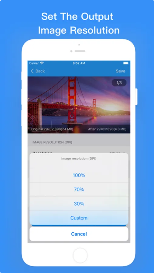 - Set the output image resolution(DPI),you can modify by percentage or customize image height and width