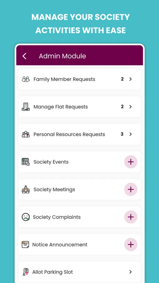 The society app was built as a complete society management system, keeping in mind every single task of a gated community: security guards, residents, management committee, facility managers, society employees, society contractors and various vendors.