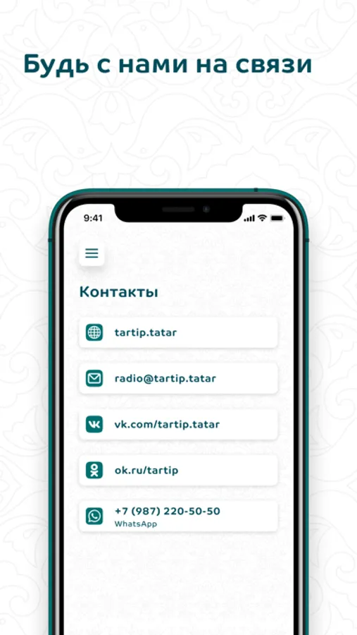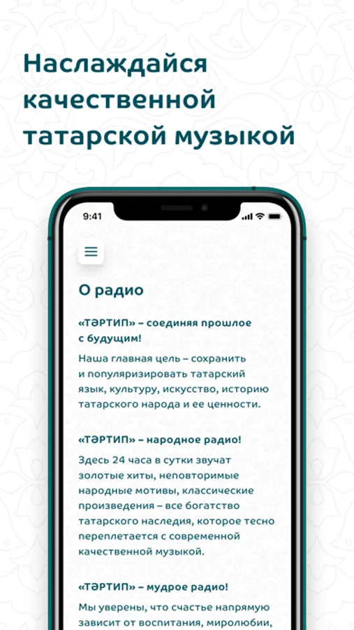 “ТӘРТИП” - это народное радио с уникальным контентом, целью которого является сохранение татарской культуры, искусства, истории и ее ценностей.
