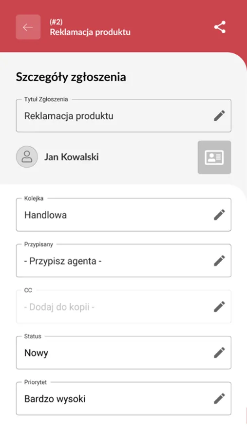Prosto z telefonu możesz przypisać się do zgłoszenia, zmienić jego kategorię, priorytet, status oraz wybrać kolejkę, do której zgłoszenie będzie przypisane.