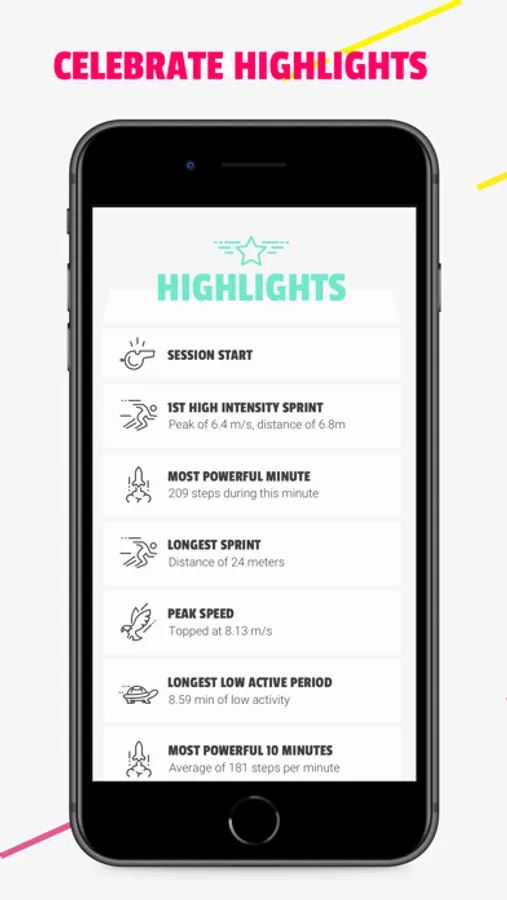 Get clear & detailed minute-to-minute highlights of your session at the touch of a finger, with tips about your Pace, Stamina, Sprints, Intensity, and Distance covered instantly after trainings and games.
