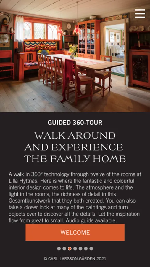 It is finally possible, through digital 360° technology, to experience the entire artist home with its fantastic, richly coloured interiors. Be inspired by the artist couple’s composite works of art that have influenced us through time. With the help of this technology we are taking our cultural heritage into the future where we can experience a large number of Carl’s paintings. Download the app and admire Carl’s magnificent monumental paintings, his beloved watercolours and inspiring details from the Home of Carl and Karin Larsson.