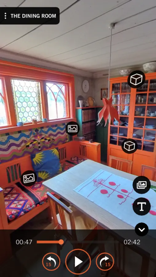 A walk in 360° technology through twelve of the rooms at Lilla Hyttnäs. Here is where the fantastic and colourful interior design comes to life. The atmosphere and the light in the rooms, the richness of detail in this Gesamtkunstwerk that they both created. You can also take a closer look at many of the paintings and turn objects over to discover all the details. Let the inspiration flow from great to small. Audio guide available.